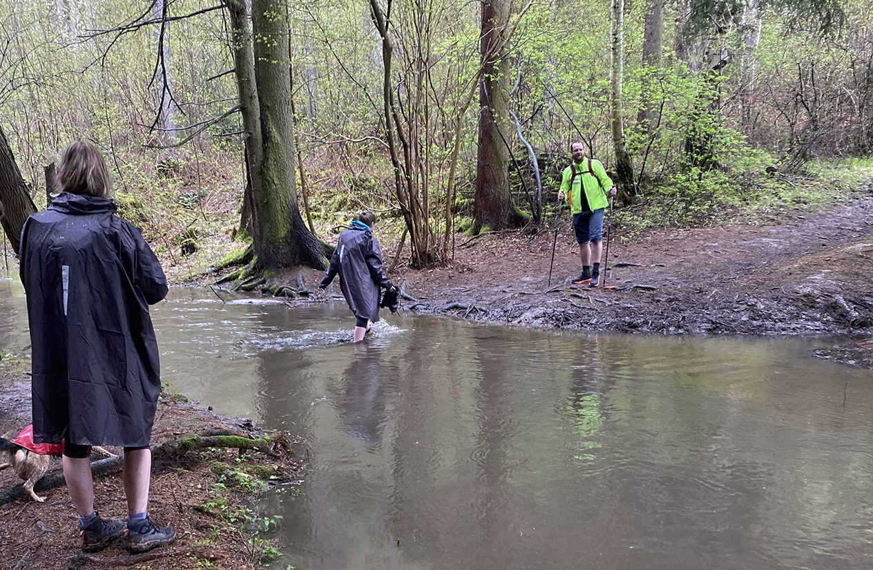 Je to nádherná scenéria. O nejaký čas za ňu platím, lebo prichádza búrka, dosť hrmí. Rozmýšľam, či sa fakt mám obliecť do vetrovky. O chvíľu leje. Vetrovku mám rýchlo na sebe. Je to však málo. Vyťahujem aj pláštenku a už len kráčam. V goratexových topánkach mám toľko vody, že by tam mohli aj rybičky plávať. Trasa 107 km sa stretáva s trasou 52 km pochodu. Pri potoku vidím dobre naladených, ale trochu bezradných ľudí. Cesta vedie priamo cez potok. Lávka chýba. Rozhodnem sa rýchlo a prebrodím ho, v topánkach.. Veď sú tak či tak mokré.